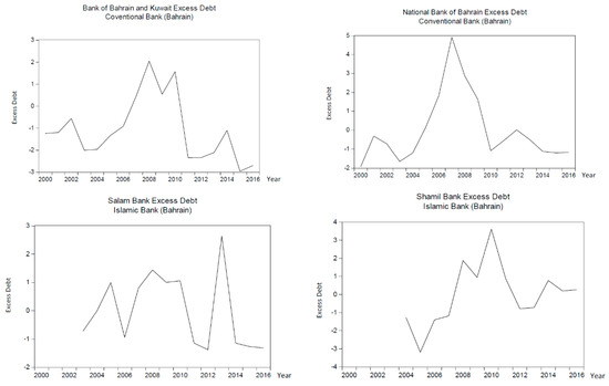 All banks in Bahrain, including Islamic banks, had excess debt in the years preceding and during the financial crisis, with excess debt higher for Islamic banks after the crisis. This occurred because Bahraini Islamic banks also highly relied on leverage, especially after the global crisis, which made them vulnerable to the second-round effect of the global crisis (Hasan and Dridi 2010). Most of the banks exhibited a rise in excess debt between 2010 and 2012, overlapping weak economic growth due to the global economy, with the sovereign-debt crisis in Europe and policy uncertainties in the United States impacting investments and companies. At times of low economic growth, companies begin to face liquidity issues and therefore request more loans, which increases the leverage of banks. Gulf Cooperation Council (GCC) economies were not immune to the effects of the global slowdown, but performed reasonably well as a result of government-sponsored infrastructure projects.