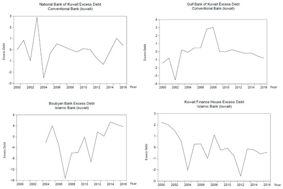 Kuwaiti banks showed a similar trend, in addition to a high excess-debt level, during 2000–2002. Overall, Islamic banks in Kuwait performed better during the financial crisis, as illustrated by the graphs, where excess debt was close to zero and not exceeding one, while it reached three for Gulf Bank, which is a conventional bank. The post-crisis effect was observed in Kuwait as well, but it was small except for Boubyan Bank.