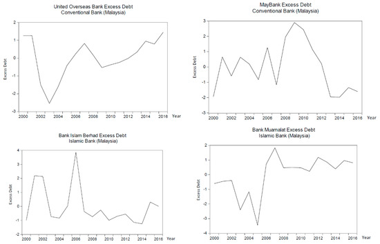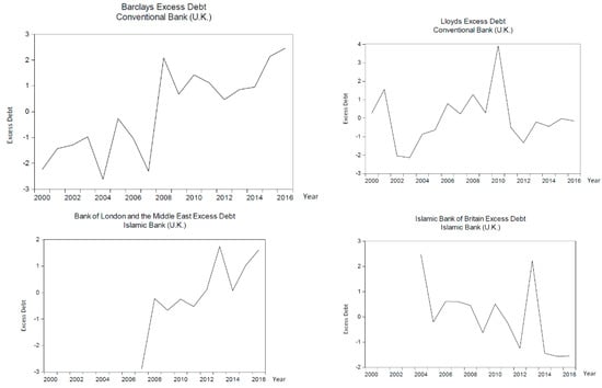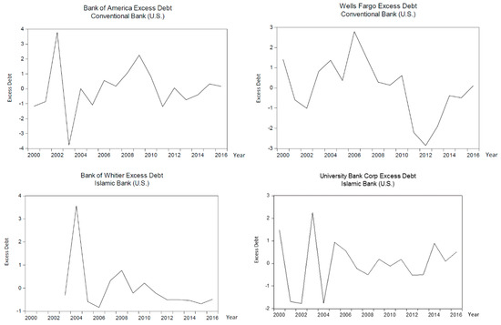For further analysis, the deviation of the banks’ actual-debt ratios from the mean over the period from 2000 to 2016 was calculated as an alternative proxy for excess-debt ratio. Excess-debt ratios were calculated for the 20 above-mentioned banks. For this calculation, each bank’s total assets and long-term debts were used to calculate debt ratios, as previously noted. Total assets represent the bank’s total balance-sheet assets at the end of the period. Long-term debts are the balance of each bank’s debts that are more than one year due at the end of each period. On the basis of the presented calculation method, the excess debts of the respective banks were calculated15, and graphs of the excess-debt ratios are exhibited in Figure 6, Figure 7, Figure 8, Figure 9 and Figure 10.