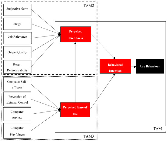 Many papers focus on how new technologies, such as tools and devices of e-banking, are accepted by users. For the first time, Davis, in 1986 in his doctoral thesis, proposed a model called the technology acceptance model (TAM) to predict the decision of users about acceptance of technologies (Davis 1993; Sepasgozar et al. 2016). TAM is a basis for technology acceptance models and is used in different fields (Sepasgozar et al. 2016). Many papers always try to examine the dimensions of technology acceptance from the perspective of users in different societies. The results of these papers show that the variables affecting the acceptance of technology in different societies are not the same, and the TAMs should always be modified (Sepasgozar et al. 2019). TAM2 is a semi-developed model of TAM, which illustrated the constructs of perceived usefulness, such as subjective norm, image, and job relevance. These types of constructs indicate that using new technology will be more useful for users who would accept the new technology to use or reject it (Sepasgozar et al. 2019). The results of studies on technology acceptance have shown that there are other constructs affecting perceived ease of use, too. Some of them are computer self-efficacy, computer anxiety, and computer playfulness. Therefore, in TAM3, which is more developed than TAM2, the added constructs illustrate using new technology will help people to live more easily than before. This developed model needs to be adopted for use in other fields of employing technology such as transportation, urban planning, and infrastructure management fields. Developing models of TAM would provide an excellent basis to decision-makers and managers in various fields, especially urban managers. A key purpose of TAM is to determine the individual IT adoption and use. Figure 1 shows the final version of TAM (TAM3), which consists of all their constructs.