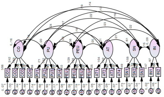 After defining the initial model in AMOS software through SEM (Shek and Yu 2014; Blunch 2012), two variables are available at the model output, which is used for the test of the hypothesis (t statistic, path coefficient). The t statistic is used for estimating variables meaningfulness (CR in AMOS); if the absolute value of t is more than 1.96, then the relationship is meaningful otherwise meaningless. The path coefficient shows the effects of an independent variable on a dependent one. It has a value between −1, +1. The absolute value of the path coefficient shows the level of impact and its direction (direct or reverse). Table 5, and Figure 5 and Figure 6 show the software’s outputs for current relationships between the model’s variables.