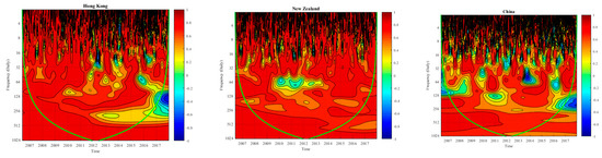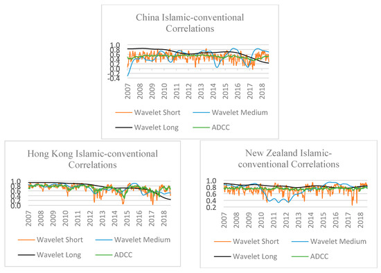 The charts plotted for the developed and emerging Asian/Pacific (Hong Kong, New Zealand and China) market’s Islamic-conventional stock indices return correlations in Figure 4 disclose the prevalence of positive Islamic-conventional correlations for the three-time horizons over the sample considered, except for the China market that depicts a temporary negative correlation at the medium-term horizon. Thus, some remarkable differences in the development of Islamic-conventional correlations across the three selected different Asian/Pacific markets, as well as in their patterns of short-, medium- and long-term wavelet correlations can be observed. For the former case, regardless of the prevalence of high positive correlations at the medium- and long-term horizons, the differences in the development of correlations can be observed at short-term wavelet correlations for the two developed (Hong Kong, New Zealand) and one emerging (China) Asia Pacific markets. For instance, the weak positive correlations for Hong Kong’s Islamic-conventional equity markets can be observed during the years 2012–2018, and for New Zealand during the years 2010–2018 and 2017. However, for China, these weak correlations can be observed throughout the sample period.