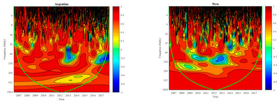 The charts plotted for the Americas market’s Islamic-conventional stock return indices in Figure 6 disclose the prevalence of positive Islamic-conventional correlations for the three-time horizons over the sample considered except for the Argentina and Peru markets; those markets depict a temporary negative correlation at the medium- and short-term horizons, respectively. Therefore, some remarkable differences in the development of Islamic-conventional correlations across the two selected different Americas markets, as well as in their patterns of short-, medium- and long-term wavelet correlations can be observed. For the former case, regardless of the prevalence of high positive correlations at medium- and long-term horizons, the differences in the development of correlations can be observed at short-term wavelet correlations for the two Americas emerging markets (Argentina and Peru). For instance, the weak positive correlations for these two markets were observed from the year 2009 onwards. However, the negative correlations for the two markets (Argentina and Peru) were observed at the medium- and the short-term wavelet correlations, respectively. For instance, for the case of Argentina, the pattern of negative correlations can be observed in medium-term wavelet correlations between the years 2013–2014, whereas for Peru, it can be observed in the short-term horizon and during 2009–2010 and 2017–2018.