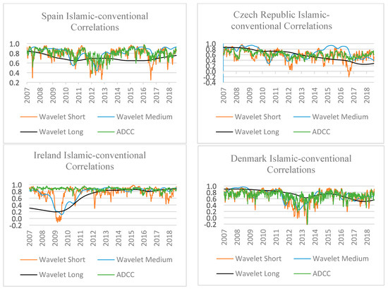 The charts plotted for the developed and emerging European markets (Ireland, Denmark, Spain and the Czech Republic) Islamic-conventional stock indices in Figure 5 disclose the prevalence of positive Islamic-conventional stock return correlations for the three-time horizons over the sample considered except for in Ireland and Denmark; those two market’s Islamic and conventional indices depict a temporary negative correlation at the short-term horizon. Thus, some remarkable differences in the development of Islamic-conventional correlations across the four selected different European markets, as well as in their patterns of short-, medium- and long-term wavelet correlations can be observed. For the former case, regardless of the prevalence of high positive correlations at the medium- and long-term horizons, the differences in the development of correlations can be observed at short-term wavelet correlations for the three developed (Ireland, Denmark and Spain) and one emerging (Czech Republic) European markets. For instance, for the case of Ireland, the pattern of the weak positive or negative correlation can be found between the years 2009–2010 and 2012, for Denmark between the years 2011–2014 and 2016–2017, for Spain, between the years 2007–2008, 2012–2013 and 2016–2017 and for the Czech Republic, between the years 2010–2018. Similarly, some differences in the long-term wavelet correlations can also be observed for two European markets (Ireland and the Czech Republic). For instance, for the case of Ireland, the weak positive correlation can be observed during the years 2007–2010 and for the Czech Republic, it can be observed from the year 2015 onwards.