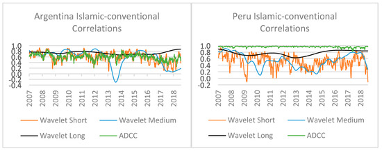 Though, for the latter case (comparative patterns), the volatile behavior is observed for the short-term wavelet correlation than the medium and long-term wavelet correlations. However, the medium-term wavelet correlations demonstrate a stable pattern unlike the short-term ones and the long-term wavelet correlations were characterized as having a more stable pattern than their short-term and medium-term counterparts. Finally, the patterns of Argentina’s ADCC correlation show similarity with its short-term Islamic-conventional wavelet correlation, whereas the pattern of Peru’s ADCC correlation resembles the long-term wavelet correlation.