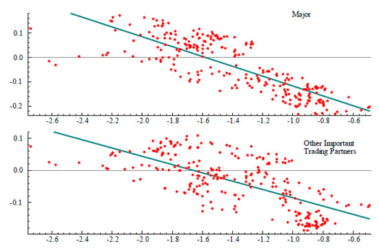 The horizontal axis represents the WTI price of oil deflated by the U.S. CPI; the vertical axis for the top panel represents the Federal Reserve’s measure for the real effective exchange rate for the major currencies. The vertical axis for the bottom panel represents the Federal Reserve’s measure for real effective exchange rate for the Other Important Trading Partners’ currencies. Variables are expressed in logarithms.