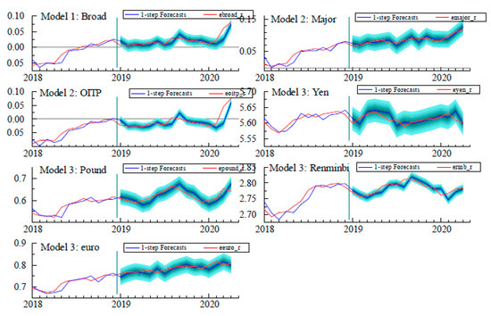 Predictive Accuracy. Projections for oil prices and bilateral exchange rates play a role in the formulation of U.S. monetary policy.22 However, for some practitioners, the pitfalls of real effective exchange rates might be acceptable if using them increases predictive accuracy. Figure 9 and Figure 10 show the 95 percent confidence bands of the models’ forecasts from January 2019 to April 2020.23
