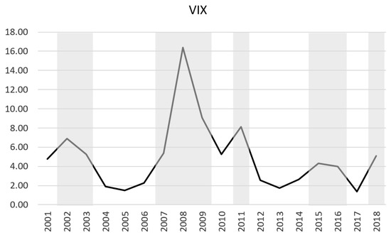 To investigate the effect high market uncertainty has on the investors’ assessment of the firm-level risk of green firms, we identify periods of high market volatility based on CBOE VIX index. The index provides a gauge of the market’s anticipated uncertainty. The higher the index, the higher the market’s anticipated uncertainty. We define high volatility periods as the years where the standard deviation of daily-VIX for the year is higher than the median standard-deviation-of-daily-VIX in the most recent five years. This approach identifies years 2002–2003, 2007–2009, 2011, 2015–2016, and 2018 as high volatility periods. Figure 1 plots the dynamics of VIX index. The grayed periods represent the periods of high market volatility.