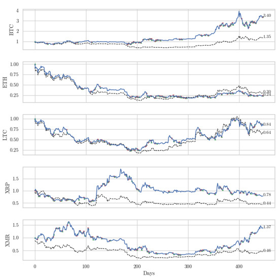 This figure shows the beginning value (1 unit of cryptocurrency) and cumulative ending value using a buy-and-hold approach (dotted black line) and our direct reinforcement model (blue line). The green and red dots in our direct reinforcement model correspond to a long or short position, respectively.