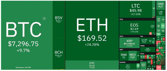 According to the latest information provided by coinhouse.com (8 April 2020), from over 2000 existing types of cryptocurrency, Bitcoin holds the market majority, as can be seen in Figure 2, totaling 64.55%.