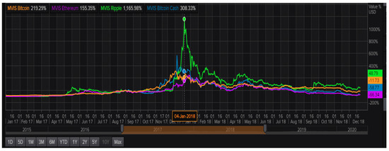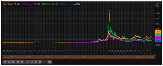 According to the data (Figure 4), the vast majority of currencies move in the same direction as Bitcoin, with small variations over the same time frame. We can conclude that the significant events that affect Bitcoin’s price, change in value, profitability, or investments also affect the entire market proportionally. To reinforce and also prove what we have already said, we present Figure 4, compiled with Thomson Reuters data, who has kept a record since 2012, way before cryptocurrency was on the rise, up to now (Figure 4). The movements made in almost the same direction were evident by observing the last three years of analysis.