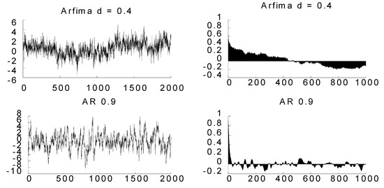 When the true parameter d is equal to zero, Equation (1) becomes a simple autoregressive moving average model (ARMA), which implies a faster convergence. One of the main problems is the case when a highly persistent ARMA reveals a significant d when it is being estimated using semiparametric and nonparametric techniques. Figure 1 illustrates simulated time series for an ARFIMA (0, d, 0) with d = 0.4 and an autoregressive (AR) process with a coefficient of 0.9. Their corresponding correlograms show patterns in the autocovariance, which illustrate the above distinctions. As can be seen, it is hard to discern the type of process visually without looking at long autocorrelation patterns over time. The correlogram, which illustrates such patterns, shows that the ARFIMA autocorrelations take a long time to converge to zero. On the other hand, the autoregressive process converges geometrically1 to zero.