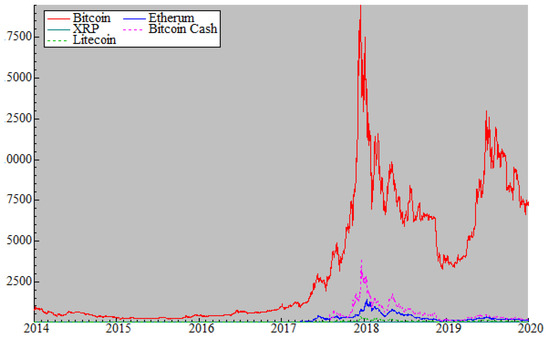 Figure 3 shows the plot of the daily closing prices for the period starting 2 January 2014 until 31 December 2019. Exceptionally, the series for Ethereum starts from 30 September 2015, and that of Bitcoin Cash from 1 August 2017. The closing prices show the predominance of Bitcoin, which had lower closing prices at the start of the sample, picked up in mid-2016, and reached its highest value at the end of 2018, and with moderate fluctuations from then on. Other currencies, such as XRP, started picking up from early 2017, but showed signs of decline by the end of 2019.
