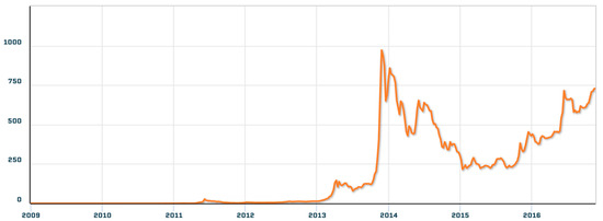 Bitcoin closing price in USD (MKPRU), [04-01-2009, 22-11-2016].