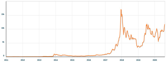 where MKPRU represents the equilibrium closing price of the market for BTC as denominated by the US dollar (Figure 1 and Figure 2). MWNUS is the number of unique MyWallet users, and TOTBC is the total BTC available in the market to date, as there is a limited amount of BTC available at 21,000,000. Our time frames are across two intervals, the first one is [04-01-2009, 22-11-2016] (Figure 1), and the second period is [01-01-2011, 01-08-2020] (Figure 2). The decision-making process uses reasonable metrics deemed viable drivers of the endogenous variables, where the following were selected as the exogenous variables: Average Block Size in, MB (AVBLS), Bitcoin Difficulty (DIFF), Number of Transactions per Block (NTRBL), Miner’s Revenue (MIREV), Change in the Number of unique addresses (NADDU), Total Output Volume (TRVOU), and Hash Rate (HRATE). A majority of the factors selected were those that had been a result of the BTC network’s transaction behavior and how the fundamental mechanics influenced the closing price. The variables AVBLS, DIFF, TRVOU, and HRATE were taken as the variables which dictated the difficulty of accessing and supplying BTC to the market. NTRBL considers the growing number of transactions occurring per block of BTC as a measure of transaction volume per available block of BTC. The NADDU variable considers the changing number of unique addresses performing BTC transactions to understand behavior trends over time. TRVOU measures the exchange trade volume of USD within the BTC market, which serves as a guideline as to how the market reacts to changes in value when buying or selling BTC. Finally, , as the list of exogenous variables, is defined in Equation (4) as: