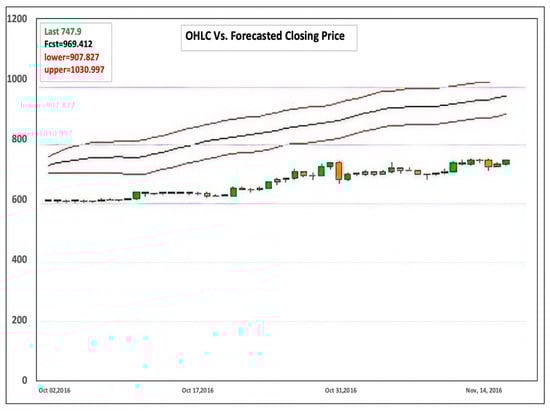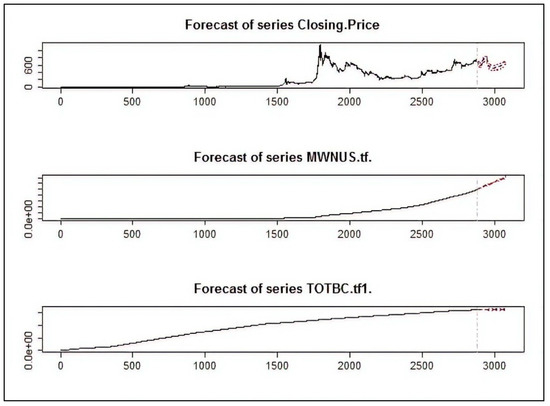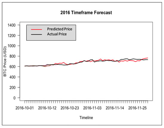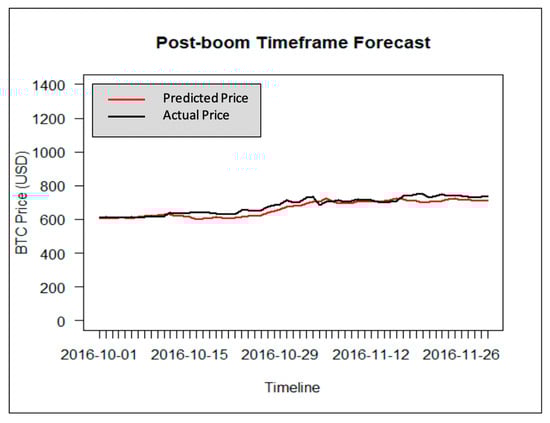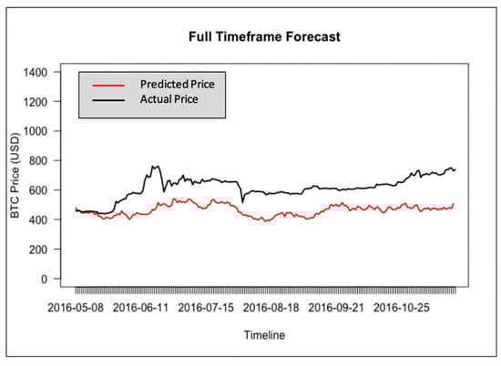 The forecasting results of Bitcoin price in USD for Full, Post-boom, and the Year of 2016 timeframes are shown in Figure 13, Figure 14 and Figure 15, respectively. The red lines in each plot are from the BTC Market Price dataset (MKPRU) of Quandl. The mean absolute percentage error (MAPE) of each forecasting result was calculated to evaluate the model performance. The forecasting of Year of 2016 and Post-boom timeframes gave good performances, as the result of the Year of 2016 timeframe has a MAPE value of 2.38% and the MAPE value of the Post-boom timeframe result is 2.85%. However, forecasting price using the Full timeframe resulted in the largest MAPE value, 19.88%. The BVAR model provided high forecasting accuracy with fewer data available or shorter timeframe in the period of [January 2009–November 2016].