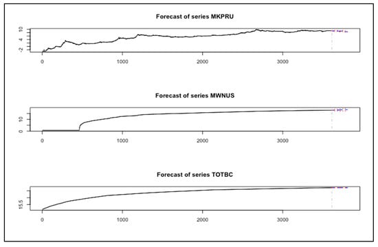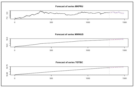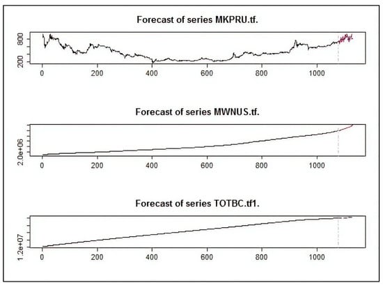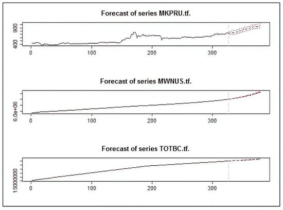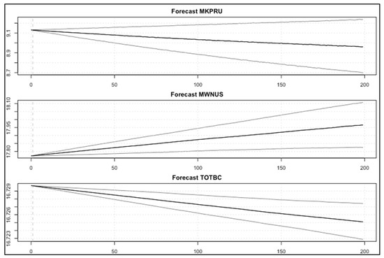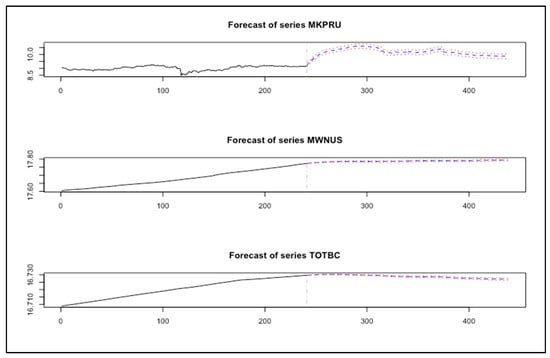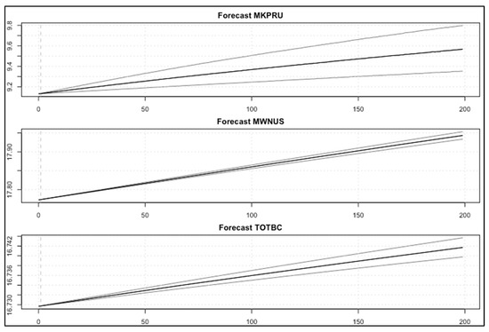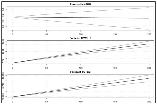 In this experiment, we evaluated the performance of the VAR model using the period [January 2011–August 2020] Full timeframe data, Post-boom timeframe data [January 2017–August 2020], and the Year of 2020 timeframe data [January 2020–August 2020], as shown in Figure 16, Figure 17 and Figure 18. We can observe that the BVAR model could predict the values of the two endogenous variables (MWNUS, and TOTBC) effectively for the Post-boom period and the Year of 2020 only, while the MKPRU variable had its best prediction for the Year of 2020 alone. This experiment confirms that the BVAR model achieves better forecasting performance for short time periods.