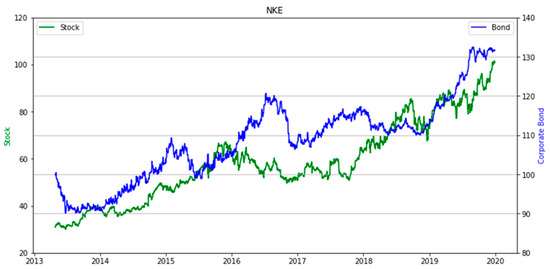 In order to illustrate this idea with a simple example, we analyzed one single company, Nike (NKE). Figure 1 displays the average historical performance of all Nike bonds reported to TRACE and their equity price series. Both prices are drifting upwards over time. Over the period from April 2013 to December 2019, Nike had an annual performance of 19.4% for its stock and 4.4% for its corporate bonds, with standard deviations of 19.8% and 6.9%, respectively. The correlation between the stock and corporate bond returns was −0.03. Given the long-term positive drift in both the equity and bond side, coupled with the low correlation between the two series, we hypothesized that a portfolio of 60/40 will achieve the diversification benefits.