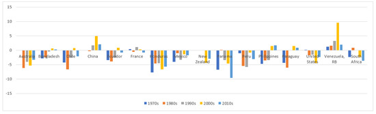 Average current account imbalances as a percentage of GDP (%): by decade. This figure presents current account imbalances as a percentage of GDP by each decade in our sample period. Data for some countries are missing for some years. Missing data Australia (1970–1988); Bangladesh, Ecuador (1970–1975); Chile, France (1970–1974); China (1970–1982); Honduras (1970–1973); Mexico (1970–1978); New Zealand (1970–1999); and Panama, Peru, and the Philippines (1970–1977). Source: World Bank database (extracted on 4 July 2020); author compilation.