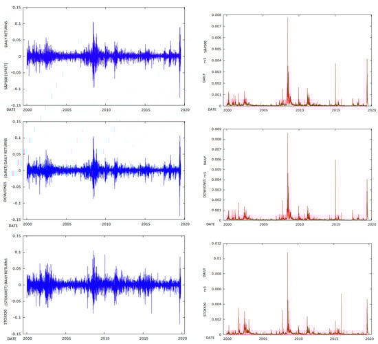 The sample data set consists of 20 years and four months of daily data of adjusted continuously compounded close to close returns for S&P 500, DOW JONES and STOXX50 indices, taken from 3 January 2000 through to 30 April 2020. There are a matching set of daily RV5 estimates for the three indices obtained from the Oxford Man Realised library. These three indices are chosen because they constitute major components of global capital markets in the US and in Europe.