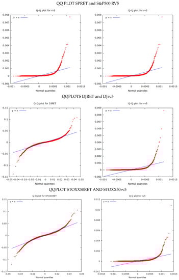 The S&P500 has a mean daily return of 0.01361 per cent and a standard deviation of 1.248 per cent. Plots of the daily returns and RV5 estimates are provided in Figure 1. It had positive excess kurtosis and does not conform to a Gaussian distribution, as can be seen from the QQ plot in Figure 2. The S&P500 RV5 has a mean of 0.00011202 and a standard deviation of 0.00026873. However, Rv5 is measured as a variance, and, if we take the square root of its value and multiply it by 100, it will be on a common scale with the S&P500 returns. We undertake this transformation in some of the comparison plots in subsequent figures. It has very high skewness and kurtosis which is also evident in the QQ plots in Figure 2.
