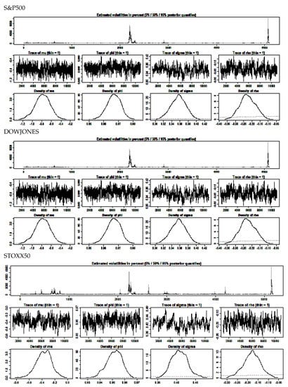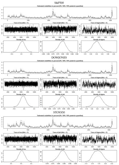 () reviews the stochastic volatility and the ARCH/GARCH literature. Other reviews are by () and (). (, p. 485), noted the difficulties in the application of the SV model: “the SV model has no closed form, and hence cannot be estimated directly by maximum likelihood”. The advantage of the stochvol and factorstochvol R packages is that they incorporate an efficient MCMC estimation scheme for SV models, as discussed by () and (). These two R library packages facilitate the analysis in the paper, which features a direct comparison of the volatility predictions of a SV model, a GARCH (1,1) model, and a simple application of a historical volatility based estimation method, as applied to the the three indices.