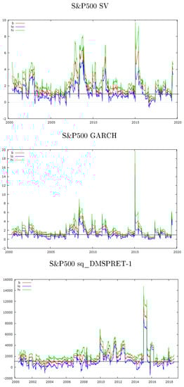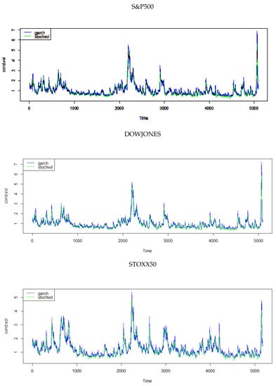 The enhanced estimates of SV were obtained by means of the R package factorstockvol and the addition of a regression matrix which included vectors of the second and third moments of the demeaned return series for the three indices. The enhanced GARCH(1,1) model was obtained by adding the squared demeaned return series to the mean equation.