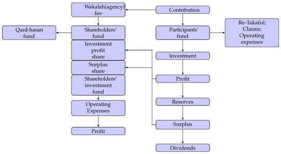 Similar to the conventional counterpart, there are two types of Takaful business model, namely: general (non-life) Takaful and family (life) Takaful. Based on business models, the operation of Takaful can be structured as Wakalah (agent-based contract), Mudarabah (profit sharing), Hybrid (mixed), or Waqf model. Under the Wakalah (agency) contract, the role of Takaful operator is a wakeel (agent) that is paid by participants as a predefined fee to manage the Takaful funds. The Wakalah fee is paid in advance as a percentage of contribution. After deducting the wakalah fee, the rest of the contributions are credited to the participants’ fund, which are also called Tabaru funds. In the Mudarabah (profit sharing) contract, the operator and the participants should agree on a profit-sharing rate at the commencement of the contract. Under this contract, all participants’ contribution is credited to the Takaful fund without any deduction. A Hybrid contract applies the Wakalah contract for underwriting activities, while Mudarabah is adopted for investment activities.