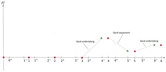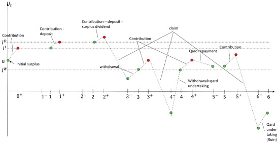 As explained in Section 2.2, there are two separate financial accounts in Takaful, namely participants’ funds and shareholders’ funds. The participants’ fund in our model is sub-divided into two separate financial accounts, namely, the surplus fund U and the investment fund . The reason for the separation of the two accounts is for better financial management, while the underwriting activities are represented in the surplus fund U, the financial activities are in the investment fund . The qard-hasan fund is a part of shareholders’ fund that is specially allocated as a benevolent loan for participants in case of deficit occurring due to underwriting activities. In our model, the drawn-down qard-hasan needs to be repaid from future surplus of the participants’ fund. We introduce the liability account to keep track of the total of qard-hasan borrowed and refunded. In our model we assume that all funds are in discrete monetary accounts. We adopt this assumption to facilitate the recursive calculation of finite-time ruin probability in Section 4.3.