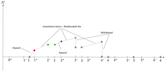 By , and we denote the values of surplus level, the investment fund, the qard-hasan fund, and the liability account, respectively, at the end of the time interval (where ). We assume that a constant contribution (premium) of is received at , while claims are applied at . We also define , and as the participants’ surplus fund, investment fund, qard-hasan facility, and liability, respectively, immediately after a claim instance but before a withdrawal, borrowing, qard-hasan undertaking, and qard-hasan repayment instance.