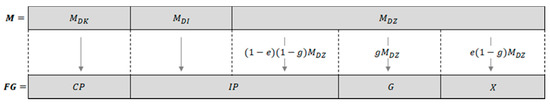 It is also necessary to divide the import of intermediate goods absorbed by enterprises () into domestic accumulation and export. For this, I introduce the coefficient . It means the share of exports in in a given period. Using this coefficient, I calculate the part of the import of intermediate goods that is used to produce goods intended for export. This value can be specified as . The remaining part of imported intermediate goods is absorbed by private enterprises for domestic absorption. I present this value as . I also introduce the coefficient . It determines the share of the part of intermediate goods imports absorbed for the purposes of gross capital formation ().