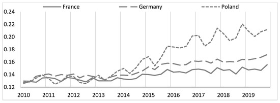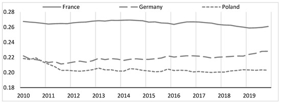 Based on the BEC division of imports, I estimated the proposed coefficients , , and . It should be remembered that and . Figure 2 shows the share of government expenditure in gross value added for the analyzed countries. These are the values of the factor which is used to calculate import-intensity levels. It turns out that the value of this coefficient is the highest in France and the lowest in Poland. I also calculated the coefficient of variation understood as the ratio of the standard deviation to the mean value of the variable under study (Abdi 2010, pp. 169–71). It turns out that the value of this coefficient is relatively small. In the analyzed period, the factor changes (coefficient of variation as the ratio of standard deviation to the average value 2010–2019) in France by 1.07%, in Germany by 1.77% and in Poland by 2.43%. On this basis, it can be said that the factor is quite stable over the analyzed period. The next figure shows the calculated coefficient . It denotes the share of total exports in gross value added (see Figure 3). The situation is slightly different here. The highest values of this coefficient occur in Poland, while the lowest in France. The factor is less stable than the factor. The share of exports in changes by 7.39% in France, by 5.88% in Germany and by 12.95% in Poland. However, this does not change the fact that the coefficient can be considered relatively stable in the short term.
