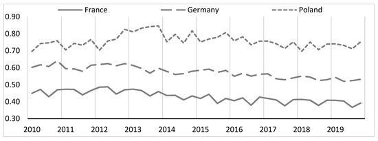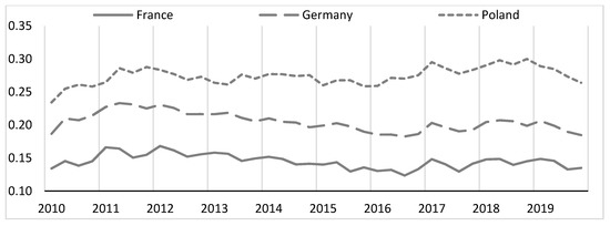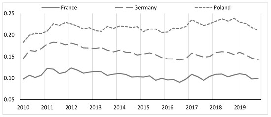 I was the last to calculate the import intensity of export ratio. The results are presented in Figure 7. In this case, a fairly stable situation in the value of import intensity of export can also be noted. The coefficient of variation in France is 8.39%, in Germany 8.33% and in Poland 7.29%. In the analyzed period, the value of this ratio declines again to the base period (Q1 2010) in Germany (−1.87%). In France, in Q4 2019, the import intensity of exports increased slightly by 1.47% and in Poland by 14.91%.
