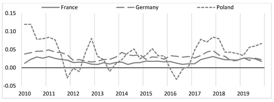 Next, I calculated the import intensity of government expenditure. I present them in Figure 5. On this basis, it can be said that government expenditure on imported intermediate goods is the highest in Poland, and the lowest in France. The coefficient of variation for France is 8.38%, for Germany 7.93% and for Poland 6.95%. In the 1Q 2010 base period, the import intensity of government expenditure decreased by −1.09% in Germany. This ratio increased by 0.56% in France and by 12.68% in Poland.