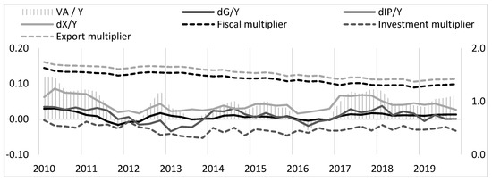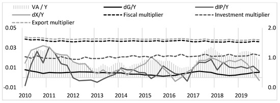 Finally, I present a summary of the results of the main variables that determine the dynamics of the growth of gross value added according to Equation (11). In the following figures, I present separately the situation of the economies of France (see Figure 10), Germany (see Figure 11) and Poland (see Figure 12). Area charts show the dynamics of growth of gross value added in relation to for individual countries (left axis of ordinate). The dashed lines show the values of individual multipliers of autonomous expenditure. These values are embedded in the right ordinate axis. The solid lines show the relationship between changes in autonomous expenditure and the value of . To determine the dynamics of changes in autonomous expenditure, , I again used quarterly absolute increases in the quarter in relation to the corresponding quarter of the previous year. As a result, the continuous lines show the relative increase in autonomous expenditure in relation to the value in the analyzed quarter.