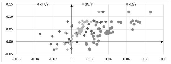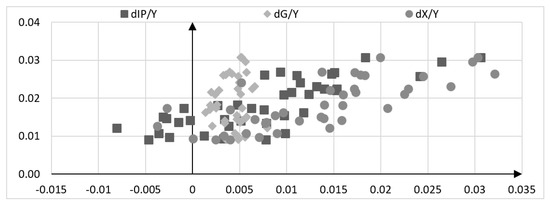 After empirically verifying the proposed method of calculating the fiscal, investment and export multipliers and relating them to gross value added, some conclusions arose. The change in gross value added in an open economy is determined by two groups of factors. On the one hand, there are injections of government, investment and export expenditure. The increase in these expenditures has a positive effect on the change in the level of gross value added. However, the increase in autonomous expenditure is not equal to the gross value added. This can be seen in Figure 13, Figure 14 and Figure 15. Here, I present the correlation between the two values. The first is the ratio of the change in autonomous expenditure to i.e., , and . The second value is the growth rate of gross value added relative to, . It is clearly visible that in each of the analyzed countries, there is a leakage of aggregate demand, which very clearly weakens the importance of autonomous expenditure. These leaks are determined by the value of the fiscal, investment and export multipliers. According to Equation (11), the growth dynamics of relative to depend on changes in individual autonomous expenditures in relation to . If this were the case, a change in the value of autonomous expenditure would generate exactly the same change in the dynamics of . This phenomenon is depicted in Figure 13, Figure 14 and Figure 15 in the form of an R-squared correlation index. This reveals the impact of changes in autonomous expenditure (ornating axis) on the change in the dynamics of (abscissa axis). R-squared correlation rates for France were 0.00 for government expenditure, 0.63 for private investment and 0.56 for exports. In Germany, these figures were 0.11 for government expenditure, 0.50 for private investment and 0.48 for exports. In the Polish economy, the R-squared ratios were 0.82 for government expenditure, 0.47 for private investment and 0.70 for exports. These figures show quite clearly that there are leaks in aggregate demand which ‘weaken’ the impact of autonomous expenditure on the change in the dynamics of compared to .