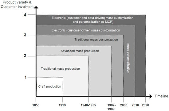 The main transformation stages of MC are based on two criteria: (a) a timeline of history including six key dates, or a time period that marks the main transformations in the context of the MC concept, and (b) a combined product variety and a customer involvement indication in a four-level scale based on the modified Gilmore and Pine II (1997) model of four types of MC.