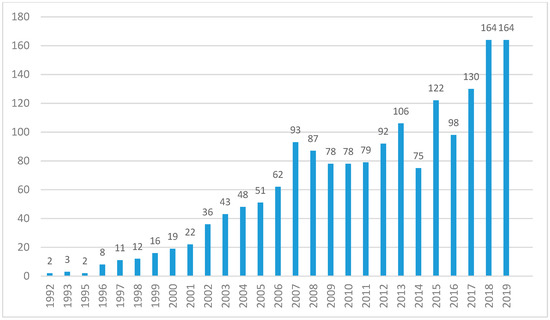 The historical development of the MC research domain during the period of 1990–2020 can be measured and evaluated by the number of scientific papers as well. An article was selected as a document type, and English was selected as a research language. It is important to note that the publication dynamics in 1990–1996 appear to have been very limited since, for example, only seven articles were published within 1992–1995 (Figure 2).
