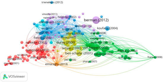 Seven predominating clusters were identified by defining a threshold of 50 citations, as per Figure 3. The red color cluster is predominated by Salvador et al. 2009 (citations n = 269) and Simpson T.W. (citations n = 349). The green color cluster is predominated by von Hippel E. (citations n = 458). The blue color cluster is predominated by Fixon S. K. (citations n = 253). The dark khaki color cluster is led by Kotha, S. (citations n = 288). The purple color cluster is led by Berman B. (citations n = 748). The light blue color cluster in the upper left corner is led by the most cited author Akkermans H.A. (citations n = 246). The light brown cluster is led by Elmaraghy H. (citations n = 206). Moreover, highly influential and closely related, but keeping clear boundaries, the four clusters (red, green, blue and khaki color) confirm that the MC domain had clear thematic boundaries in the first two decades. It is undoubtedly important to outline that a less influential and cross mixed part of the figure stands for the domain transition to an interdisciplinary approach and, later, to practical outcomes, which came into clear recognition in the past decade.