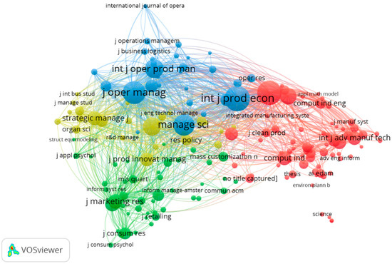 The results show that the International Journal of Production Research (IF2019 = 4.577) published the majority of articles (135 articles, 7.57% of 1783), followed by the International Journal of Production Economics (IF2019 = 5.134) with 65 articles and the International Journal of Advanced Manufacturing Technology (IF2019 = 2.6.33) with 64 articles. It should also be noted that six out of seven of the most cited scientific journals belong to the engineering, manufacturing and computer science fields. This situation confirms that customization research topics in the overall MC research domain are strongly related to a still vital legacy and an interest in tangible products. The co-citation analysis of journals demonstrates five clusters in total, where not only product manufacturing and operations management hold predominant positions, but also journals oriented to end-user studies are distinguished, as per Figure 4. It should be specified that the results were presented by following a benchmark of at least 50 citations, using specific characters and logic to illustrate a relatedness level, elaborated in the paper above.