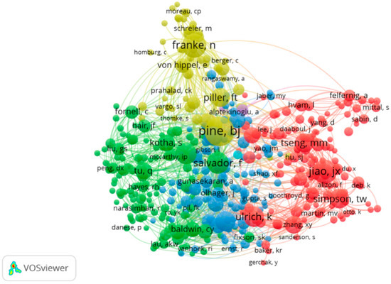 The analysis of the co-citation of scientific journals led to four clusters. The biggest cluster in red color is predominated by the International Journal of Production Economics (total link strength n = 88,825). The green cluster is led by the Journal of Marketing Research (total link strength n = 34,766). The blue color cluster is led by the International Journal of Production Economics (total link strength n = 93,691), the Journal of Operational Management (total link strength n = 106,710). The khaki color cluster is predominated by the Harvard Business Review (total link strength n = 46,129). The nodes and edges of the red cluster confirm the above defined transition period of the MC research domain in the past decade as well as an increased concept focus on modelling end-user behavior and their experience management, and an overall combined methods application in customization processes. Supplementary results came from the author co-citation analysis, as per Figure 5. It should be specified that results were presented by following a benchmark of at least 20 citations, using specific characters and logic to illustrate a relatedness level, elaborated in the paper above.