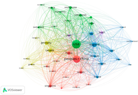 There are five predominate clusters identified, as per Figure 6. In the middle-bottom part, the cluster in red has the People’s Republic of China (with 39 links; total link strength n = 243,530) as the leading country. In the middle-top part, the green color cluster has the USA (with 39 links; total link strength n = 243,530) as the leading country. In the right part, the blue color cluster has England (with 39 links; total link strength n = 121,523) as the leading country. In the left part, the khaki color has Germany (with 39 links; total link strength n = 56,074) and Canada (with 39 links; total link strength n = 68,669) as the leading countries. In the middle and right parts, the purple color cluster identifies a relation between two countries, Brazil (with 39 links; total link strength n = 31,690) and Japan (with 39 links; total link strength n = 12,661). Moreover, similar tendencies are identified by analyzing numbers of the most productive countries regarding the MC research domain in 1990–2020, as per Table 3.