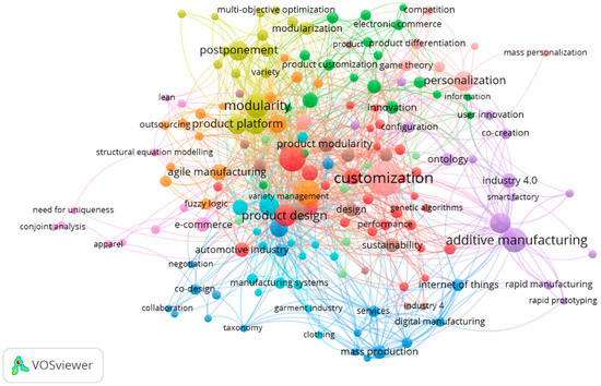 Co-occurrence of author’s keywords in the Mass Customization domain (1990–2020). Source: Composed by the authors using VosViewer software.