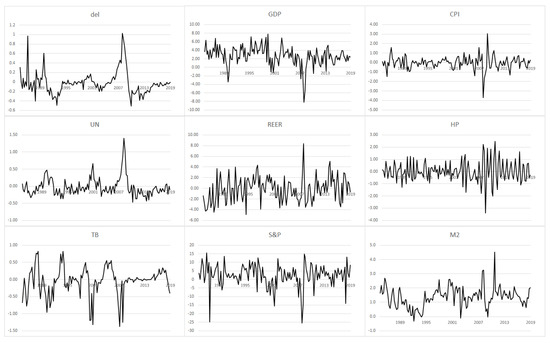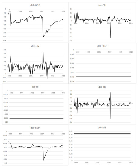 In Figure 1, we illustrate the profile of the nine variables. All the macroeconomic variables present peaks at the end of 2008 and beginning of 2009: negative for , , , and , but positive for , , and . shows more erratic behaviour. Similar trends hold in terms of the early 1990s recession, in particular for (negative peak), (negative peak), and (positive peak). These two subperiods correspond to the spans with the largest increases in the delinquency rates.
