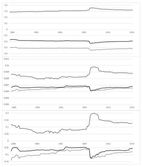 Conditional correlations (time-varying coefficients) between and (gray line), and (black line) and (dotted line), derived from 3-variate models. Time span: q4–1989 q1–2019. Top Panel: correlations derived from DCC model. Middle Panel: Time-varying coefficients in the NLARC model. Bottom Panel: correlations derived from NLARC model.