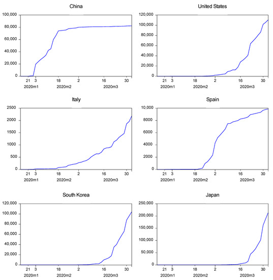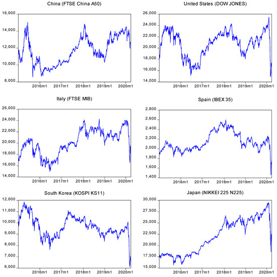 where for country i at day t the closing stock price is represented in , and it would be assumed as the growth rate of the last price registered of the stock market, equivalent to the difference in natural logarithms. Similarly, the same idea is used for the growth rates of the current exchange rate for the countries of analysis and the prices of the commodities. We use daily stock market data from China, the United States, Italy, Spain, South Korea, and Japan during the period from the 1st of January of 2015 to the 1st of April of 2020 (Datastream 2020).