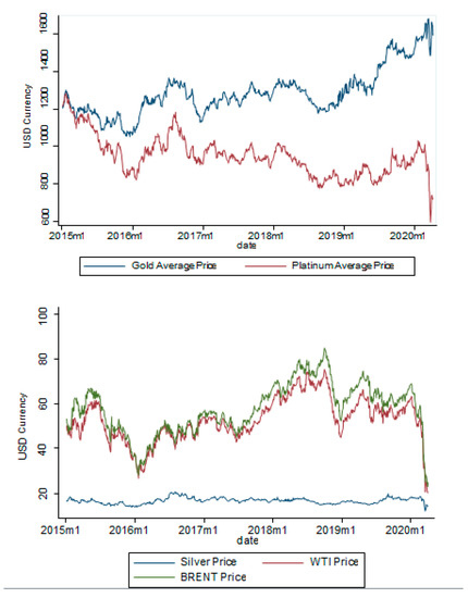 Since the financial market is closely linked with the commodity market and the overall economic production, the prices (as a measure of value) of the commodities are also influenced by COVID 19. In January 2020, it can be seen from Figure 3, that a significant prices’ drop-down started to appear with the outbreak of coronavirus across countries and it was more intense for the commodities of Gold, Platinum (measured in 1 troy ounce for each), Brent and WTI crude oil (measured in 1 barrel of oil).