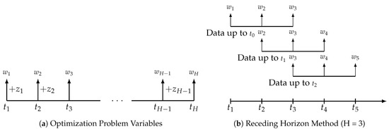 At each time period T, a multi-period optimization problem using information (risk, return, and transaction cost estimates) known at time T is solved for H periods ahead, where . Despite obtaining optimal actions for multiple future time periods, only the first period’s actions are implemented, and the optimization problem is solved anew with updated information gained at time (see Figure 1a,b). This receding horizon procedure simplifies the full horizon dynamic programming problem while maintaining fast reaction times to changing financial markets.