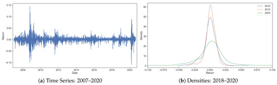 Looking at the time series of returns for SPY, the most popular ETF tracking the S&P 500 Index (Figure 2a1), we can visually observe these shifts. Following periods of more subdued volatility, abrupt spikes materialize and cluster together. The U.S. market underwent a very long stretch of a calm bull market from 2009 to 2020. However, this period sharply contrasts to the global financial crisis in 2008 and the onset of the severe COVID-19 pandemic in 2020. Looking closer at the return densities for 2018–2020 (Figure 2b2), the difference between their shapes is apparent. None of the three years seem to be close to what Markowitz’s original theory assumes, a Bell curve. 2018 and 2019 have pronounced left tails, while 2020 is an outlier with wide left and right tails. Similar regime shifts, some periodic (expansions followed by recessions) and some unique (global events such as the recent COVID-19 pandemic), are found across a wide array of financial markets and macro variables (Ang and Timmermann 2012).