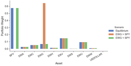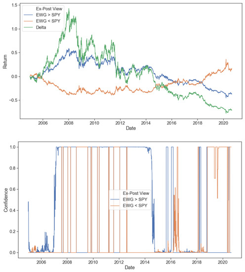 Regime switching can be used to completely remove the need to define a subjective degree of confidence in the investor views provided to the BL model. From Equation (3), we know that the expected return for an the investor’s view portfolio is expressed as . However, given that we have already estimated the underlying regimes driving each asset’s return, we can also compute it directly from these estimates: